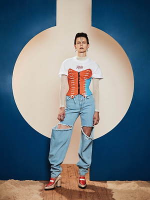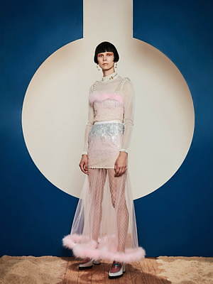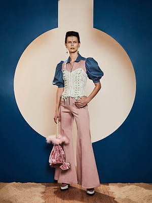 過去を象徴するピースとして選んだのは、クラシカルなデザイン。レースアップのブラトップは、ドレスの下のコルセットを思わせ、ボリューミーなパフスリーブや大振りなフリルといったディテールは、プリンセスがかつて纏っていたドレスを想起させる。