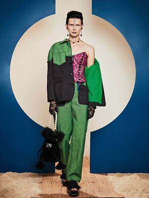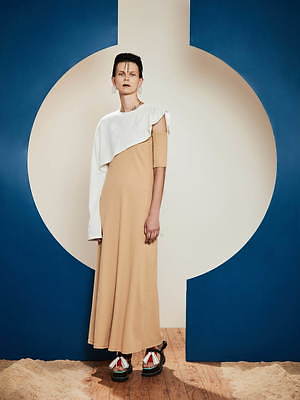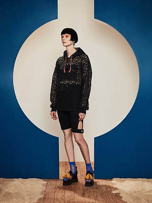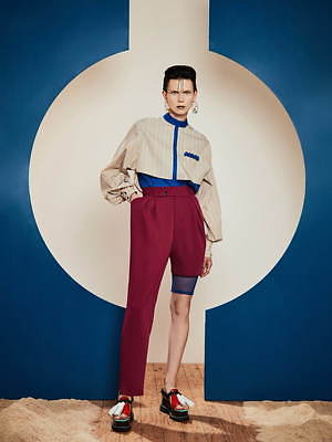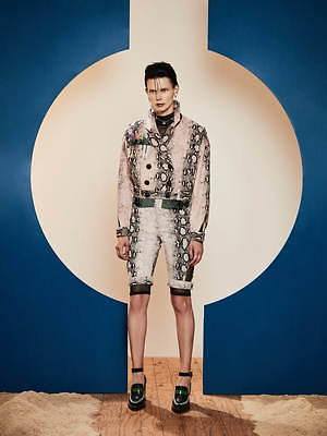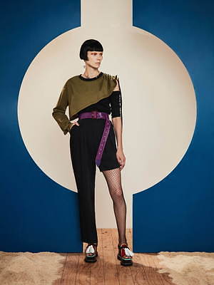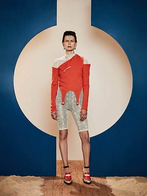 同様にアシンメトリーなフォルムも繰り返し取り入れられ、片腕は長袖、もう片腕はショートスリーブといったトップスや、右足はロング左足はショートのパンツなど、左右不均衡なデザインが提案されている。