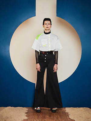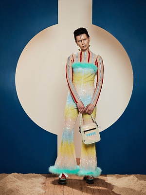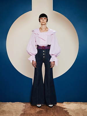 また、コントラストを効かせたフォルムも印象的だ。裾が大きく広がったベルフレアなシルエットは多用され、スパンコールのオールインワンや、パフスリーブ袖のジャンプスーツなど、さまざまなピースに起用されている。