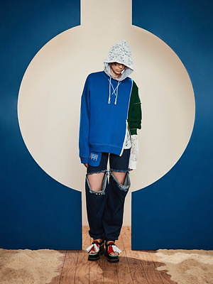 機能性を象徴するのは、2WAY仕様のウェアだ。ダメージ風のデニムパンツは、普通に足を通せばロングパンツに、膝位置から足を出せばショートパンツになるという、ウィットに富んだ仕様。開襟シャツも同様に、アームのボタンを開閉させることで、シルエットを変えられるハイブリッドなデザインとなっている。
