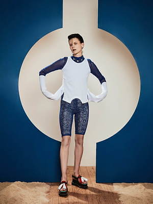 一方で、未来から迎えたのは、ミニマルで機能的なデザイン。ピタッとフィットしたレギンス風ショートパンツやシースルーのハイネックトップスは、無駄がなくフューチャリスティックな印象だ。