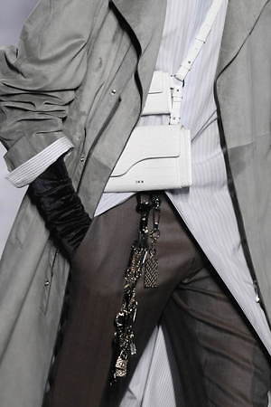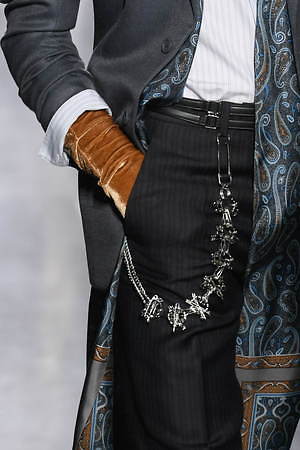 象徴的なのは、たくさんのチャームが取り付けられたアクセサリーだ。テーラードジャケットに取り付けられるアクセサリーパーツや、ネックレスのように纏えるストール、胸元に輝くブローチ、スラックスに取り付けられたチェーンベルトなどには、コインや鍵、安全ピン、バラ、犬など、さまざまなモチーフが起用されている。