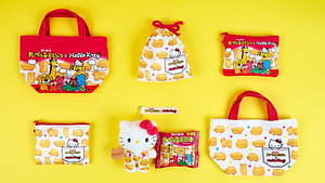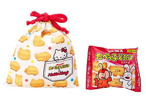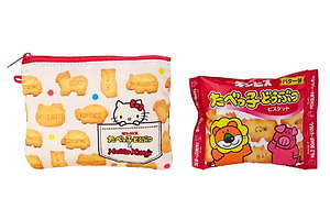全11種のラインナップには、ハローキティのフェイス形のビスケットを持ったマスコットホルダーのほか、2種類で展開するミニ手提げバッグ・ポーチ・缶ケース・プラマグ・巾着を揃えた。それぞれに「たべっ子どうぶつ」の食べきりサイズの小袋がセットととなる。