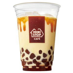 「タピオカプリン」は、クリーミーな甘みのプリン風味ドリンクに、本場タイ産キャッサバ澱粉を使用したカラメル味のもちもち食感タピオカをたっぷり入れたミニストップの自信作。さらに後がけで、ほろ苦いカラメルソースを加えている。