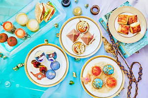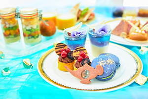 2019年開催時に好評を博した「アラビアンナイト アフタヌーンティー」がリニューアルして再登場。スタンドには、星が輝く砂漠の夜空をイメージしたピスタチオのマカロン、魔法のランプをモチーフにしたステンドグラスクッキーといった「アラジンと魔法のランプ」から着想したスイーツをラインナップ。彩り豊かな見た目も楽しい。