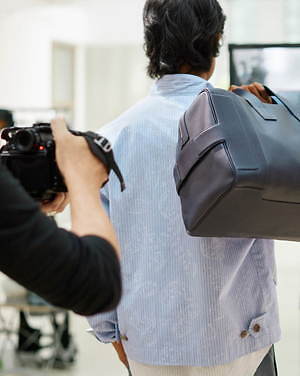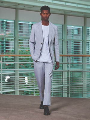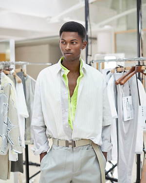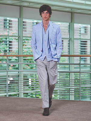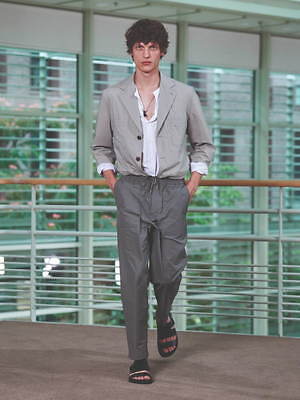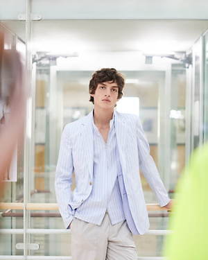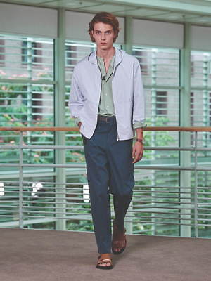 ジャケットやブルゾンには、シャツのしなやかな質感とストライプ模様を引用し、軽やかな雰囲気に。他方でシャツにはライニングなどをあしらって、ブルゾンを彷彿とさせるボリューム感を持たせた。足元にもブラウンやブラックのシックなレザーサンダルを合わせるなど、軽さと重さを巧みに交叉させている。