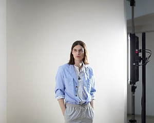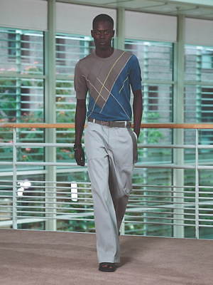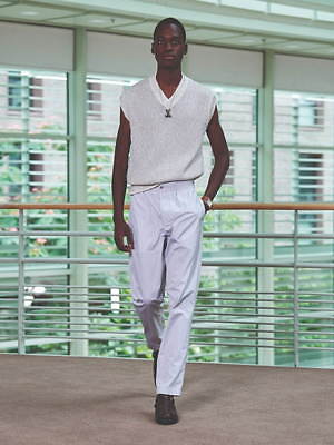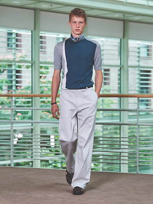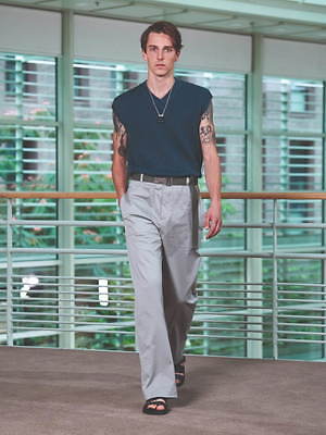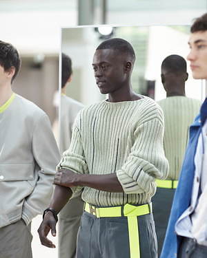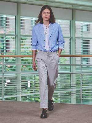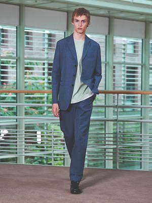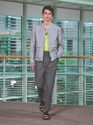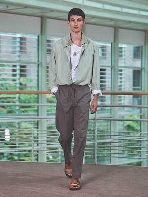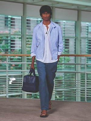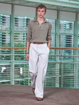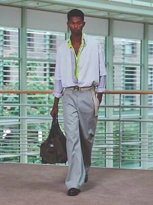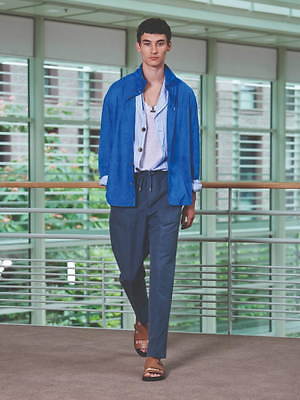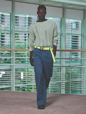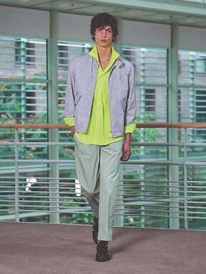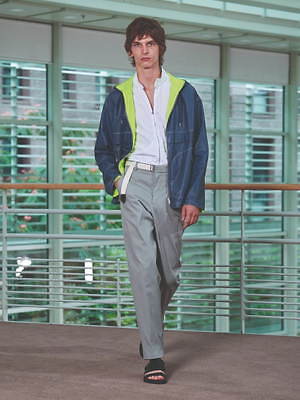 コレクション全体を覆うのは、すっきりと爽やかなカラーリングだ。ペールブルーから海の底のように深みのあるネイビーまで、濃淡さまざまのブルー、あるいは穏やかなグリーンやベージュは、いずれも涼しげなムードを演出する。そうしたなかにあって、ベルトやシャツブルゾン、アウターの下に重ねたシャツのヴィヴィッドなネオンイエローは、ナチュラルな色味に溌剌とした活気を添えている。