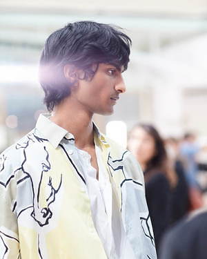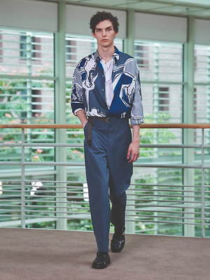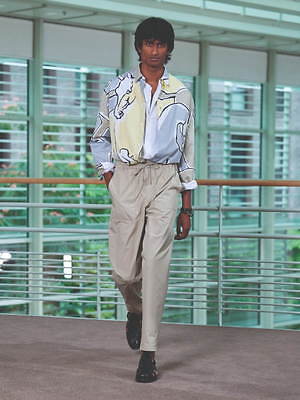 無地やさらりとしたストライプが中心であるコレクションでひときわ目を惹くのは、「La Danse des chevaux(馬のダンス)」柄をプリントしたコットンシャツだ。品のある配色ながらも大胆な柄を施したこのシャツは、フロントボタンを開けてジャストなシルエットのスラックスやイージーパンツにタックインすることで、上品さと抜け感の絶妙なバランスで着こなした。