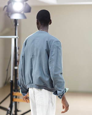 生地にはリネンやコットンなどの軽やかな素材を使用する一方、レザーも春夏に向けて雰囲気を改める。ラムレザーは、ヴェロア素材の柔らかな質感を活かして、ほどよい色気とリラックス感を漂わせるシャツジャケットにアレンジ。また、しなやかなディアスキンは、ノーカラーでミニマルさをほのめかしつつも、袖や裾のリブや外付けのポケットでカジュアルなスタジャン風に仕上げるなど、レザーの表情を多面的に引き出している。