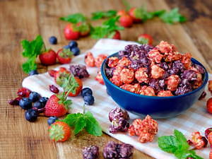 ポップコーンには、3種類のベリーを贅沢に使用。爽やかで甘酸っぱいベリーの味わいと、ほろ苦いキャラメルが絶妙にマッチした一品となっている。