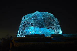 期間中は、1000万色以上の色彩表現ができるLED照明器具を使って、この展望台全体を覆うフレームをライトアップ。蛍の飛び交う様子や、夏の雨をイメージしたネオンが内側から灯り、幻想的な空間が現れる。