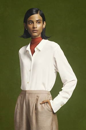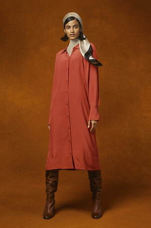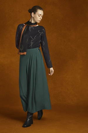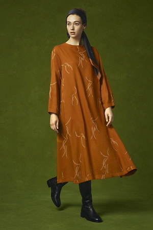 特徴的なのは、草木から着想を得た植物モチーフのオリジナルプリント。落ち着いた色味のブラウンカラーのワンピースやブラックのブラウスなどにあしらわれており、生き生きとした自然を思わせる仕上がりに。