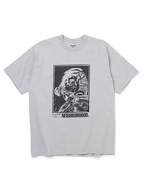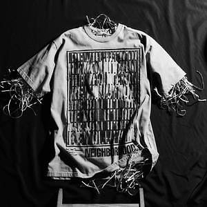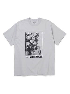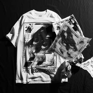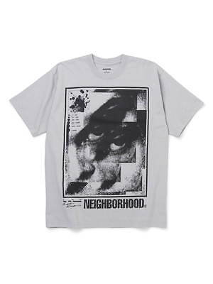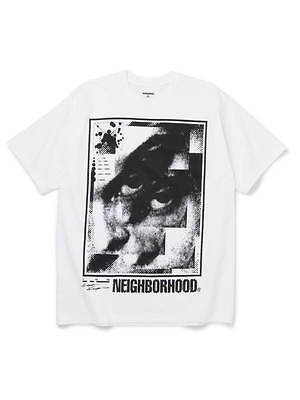 ネイバーフッドとのコラボレーションTシャツには、新たに制作したアート作品をネイバーフッドのグラフィックとともにモノクロプリント。異なるプリント技法を駆使してコラージュアートの立体感を表現し、シュールなグラフィックの存在感を強めている。
