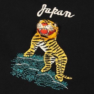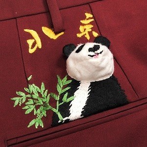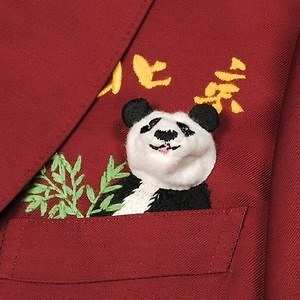 ジャケットの胸ポケットやチェックシャツの胸元、Tシャツのフロント中央には、笹をもったパンダと笑顔のトラが現れる。それぞれ“Japan”または“北京”の文字を添えて配した。