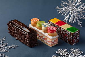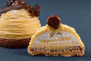 さらに「Grande H de Luxe」は、ラム酒の香りが広がるチョコレートケーキ。ヘーゼルナッツのスポンジ生地をベースに、ブラックベリーのジャムやラムレーズンのマロンブリュレなどを重ね、なめらかな口当たりのオリジナルチョコレート「Grande H」で艶やかにコーティングした。