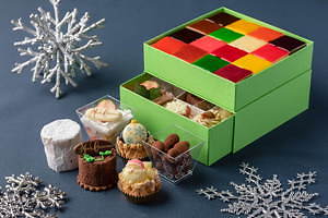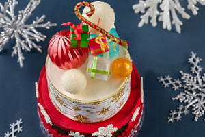 「Draw Your Happiness」は、クリスマスオーナメントを飾り付けた、2段の新作ケーキ。チョコレートスポンジとガナッシュを層状にした人気チョコレートケーキ「マルキューズ」の上に、「苺とピスタチオのムース」を重ね、鮮やかな飴細工のオーナメントでデコレートした。