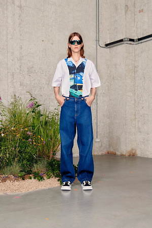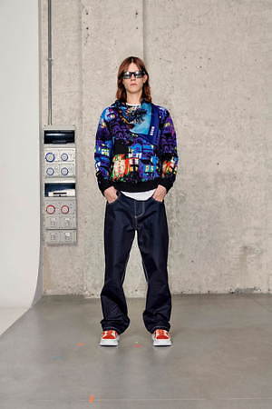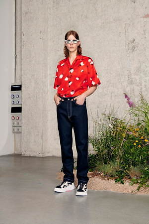 なお今季は、アメリカ人画家セス・アームストロングによる3作品を、コレクションを彩るモチーフとして起用。中でもハリウッド・ヒルズにある自然溢れる住宅地区にちなんだ作品「ローレル・キャニオン」(2018)は、ローレル・キャニオンの制限された家屋に住む住民たちのプライベートを、覗き見するような視点で描いたシニカルな画風が印象的だ。