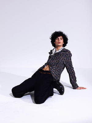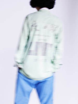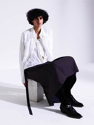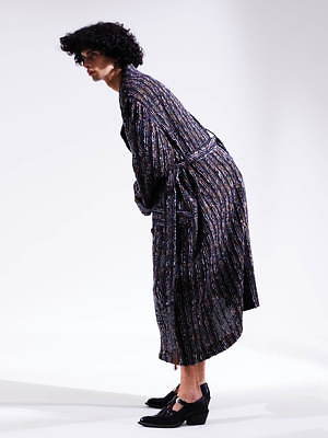 一本ずつ制作した経糸を丁寧に織り合わせる、新たな手法で作ったガウンもアイコニックなアイテム。絣染めを施した経糸にモールやスパンコールを織り交ぜることで、雨に濡れたコートの様なキラキラとした表情を生み出した。