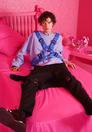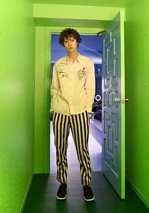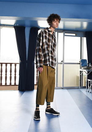 パンキッシュなムードも今シーズンの特徴の1つ。若者たちの反骨精神を代弁するかのような、ボンテージベルトをボディに張り巡らせたトップスや、ブリティッシュチェックのパンツ、力強いメッセージを描いたロングTシャツ、モノトーンのストライプジャケットなどが揃う。