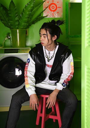 もちろん家の外でもおしゃれを楽しめるよう、ミルクボーイらしいポップでエッジィなデザインは健在。パープルのカーディガンのアームには、眩いばかりの輝きを放つグリッターラインを配して。スウェットトップスのフロントには、グラデーションカラーで描いたベアモチーフと“ドリームハンター”のロゴを大胆にあしらっている。