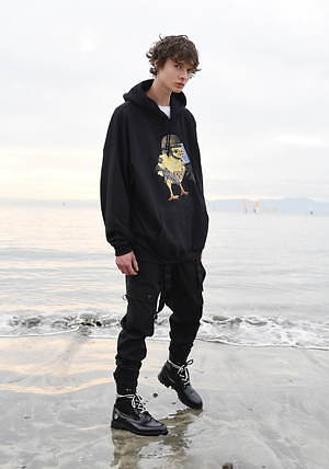 ミリタリーテイストも気分。パラシュートジャケットやカーゴパンツなど、アーミーなウェアをモダンにアレンジし、ストリートでも着用できるアイテムに仕上げている。つぶらな瞳の愛らしいひよこが戦闘服をまとったプリントフーディーも、ミルクボーイらしいアイロニカルな一枚だ。