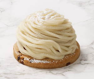 「アン・モンブラン」は、プラリネから発想を得たモンブラン仕立てのスイーツ。カシューナッツのペーストと白あんを合わせたクリームを、スイートチョコレートムースの上にモンブランのように絞っている。ベースの焼き菓子は、砂糖の代わりにあんを使うことで、干菓子のような食感に仕上げた。
