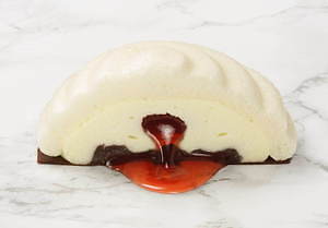 一方「アン・パルプドーム」は、ふんわりとしたメレンゲ菓子・メルベイユをアレンジ。柔らかな酸味のカカオパルプ入りメレンゲでホワイトチョコレートムース、粒あん、いちごソースを包み込んでいる。