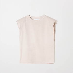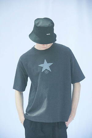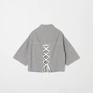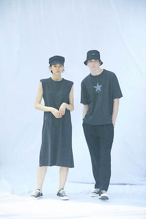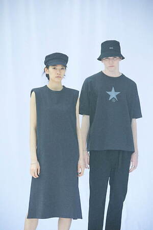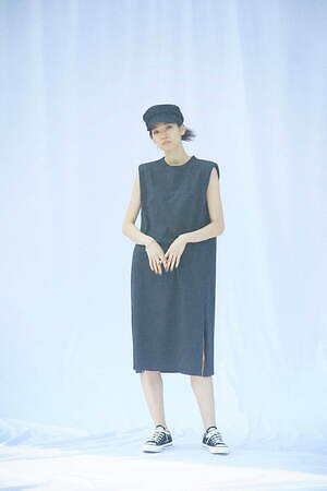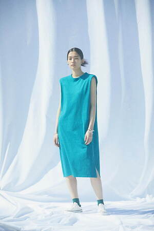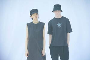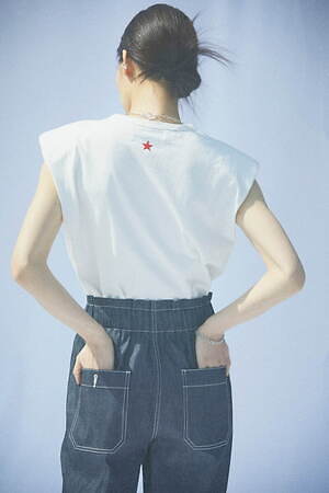 また、デニムの一大産地である岡山県の工場にて特殊加工された、ヴィンテージライクな「ワンスター」Tシャツや、パワーショルダーのカットソー&ドレスなど、天竺素材のアイテムも登場。パワーショルダーの肩パッドは取り外すことができ、気分や着こなしに合わせて表情を変えて楽しめる。