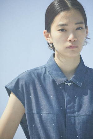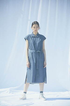 ライトオンスのデニム生地で仕立てたエアリーなデニムシャツやワンピースには、細かいドットプリントをオン。それぞれインディゴ、グレーの2色を展開する。グレーデニムは、ロープ染色された硫化染めによる絶妙なニュアンスカラーが魅力だ。