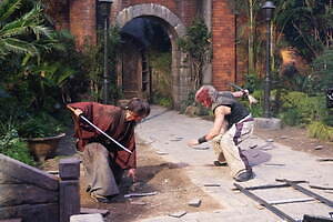 ふたりが立つ六角堂に用意されたのは、天井から垂れ下る複数のワイヤー。ふたりの身体にきつく設置されたそれは、大の大人たちが数人がかりで引っ張ることで、身体が浮き上がり、ふたりがそれに合わせて空中で身体を動かすことで、剣心と縁の感情がぶつかりあう臨場感たっぷりのシーンを撮影できる。