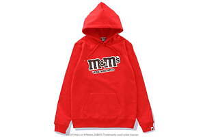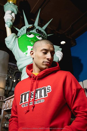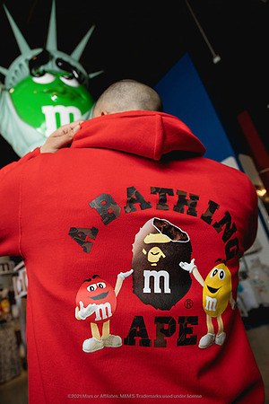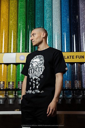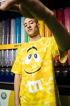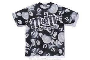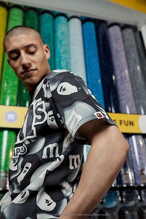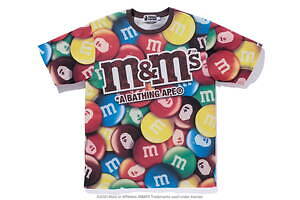 中でも注目したいアイテムは、全面に「エムアンドエムズ」のチョコレートをプリントしたカラフルなTシャツ。チョコレートには、通常の“m”に加えてア ベイシング エイプのアイコニックな“エイプ ヘッド”ものせ、コラボレーションらしいデザインに仕上げた。