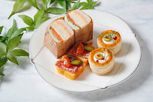 中段は、抹茶タルトに甘く煮た黒豆をトッピングした「抹茶と黒豆のタルト」など、“和の素材”同士をコンビネーションさせたスイーツを展開。また、「ハムとチーズ、サーモンときゅうりのサンドウィッチ」「サラミのオープンサンド」といったこだわりのセイボリーは、下段に並べている。