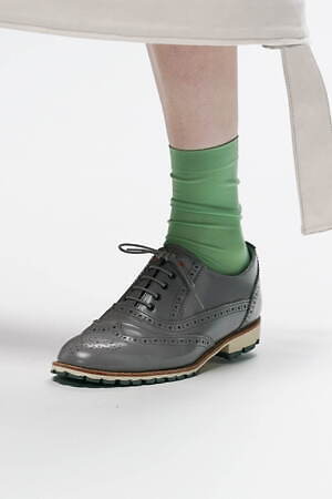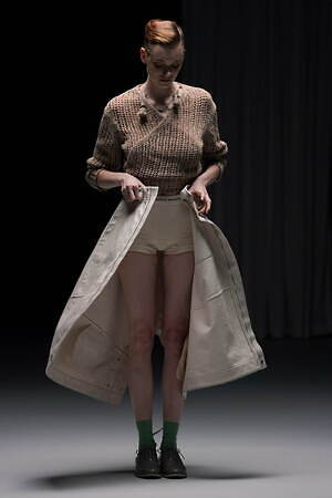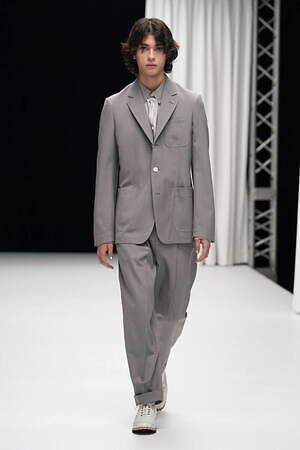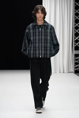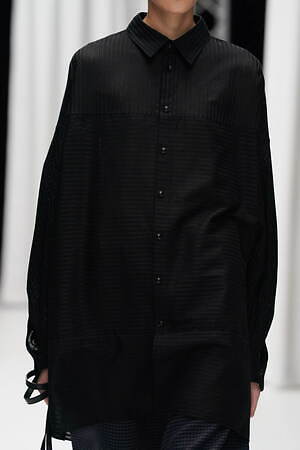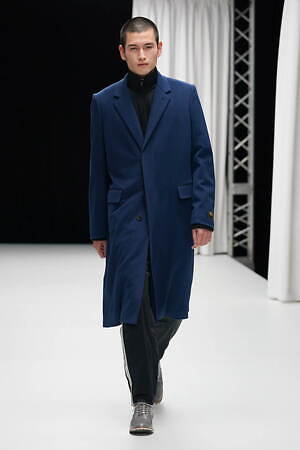しかしその“変化”は実に一瞬のことで、洋服に何が起こったのか、やや時間を要した。モデルが洋服を反転させて纏ったライダースジャケットは、洋服の構造ががらりと変わり、なんとダブルカラーになっているではないか。アイテムそのものではなく、ディテールを変化させて、新たなムードを宿した洋服は、まるで手品を見ているかのような驚きと発見を与えてくれる。