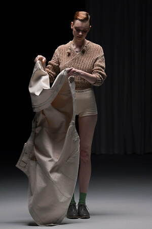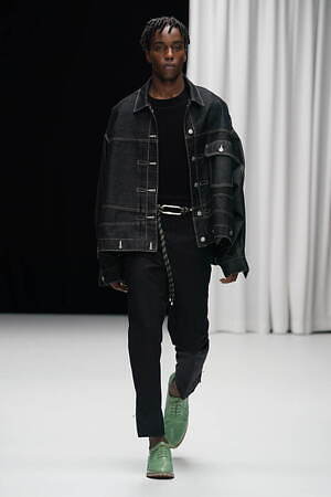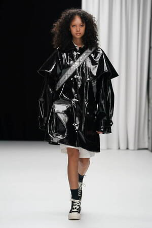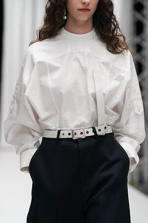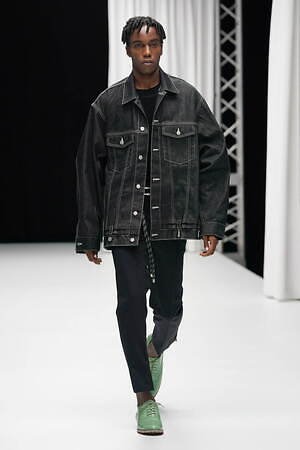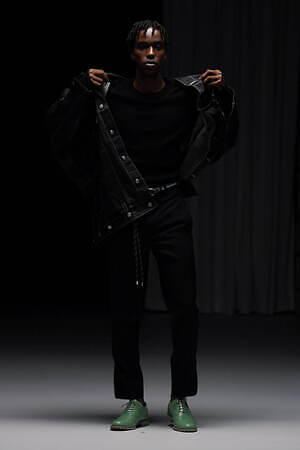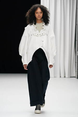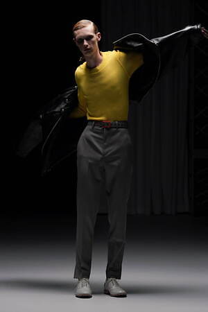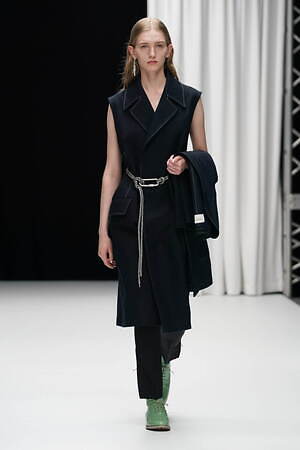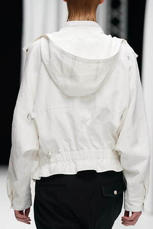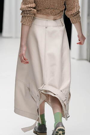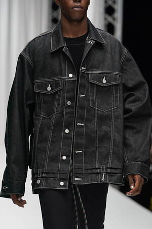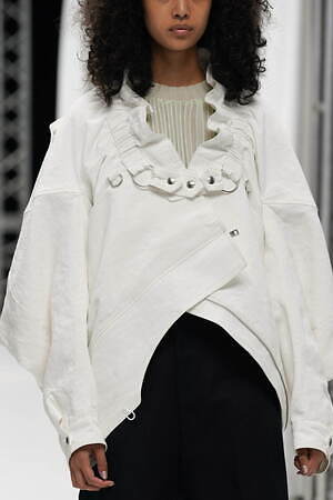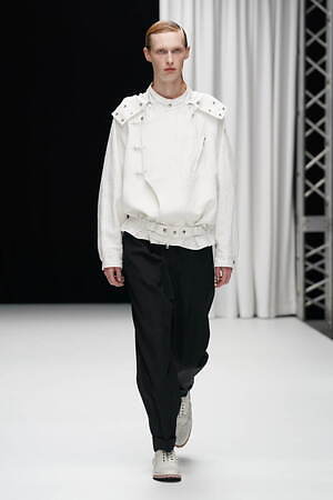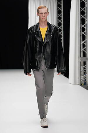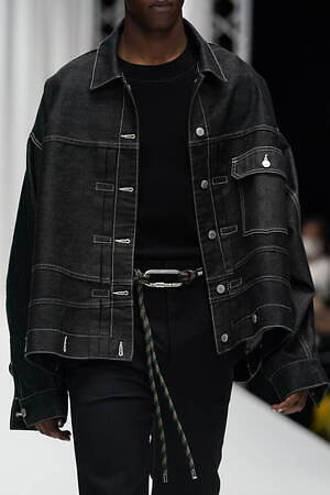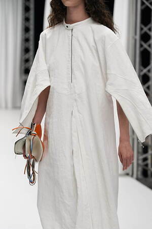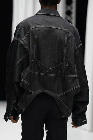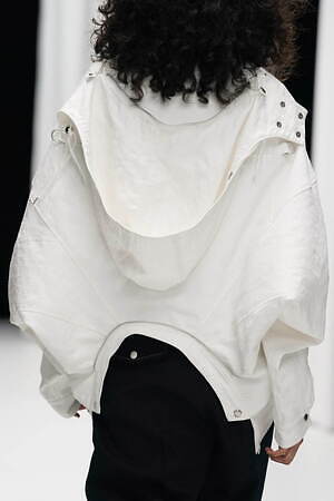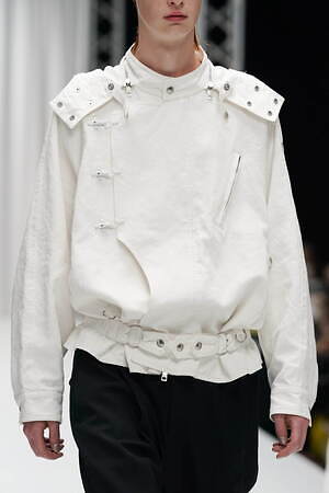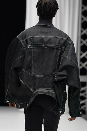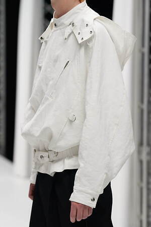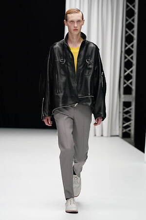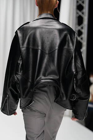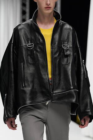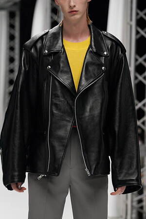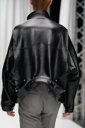 そんな今季の発展を具現化したのが、ブランドのアイコニックなアイテム“ライダースジャケット”を使用した演出である。ややゆったりとしたシルエットを持ちながら、ノーカラーで仕上げたライダースジャケットは、あらゆるパーツにジップが張り巡らされているのが印象的。過去のコレクションを目にしていた観客は、これが一体どんなアイテムに変化するのだろう…と、その変化に熱い視線を注ぐ。