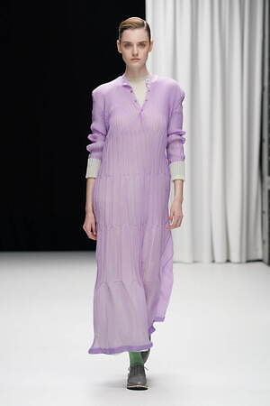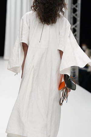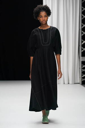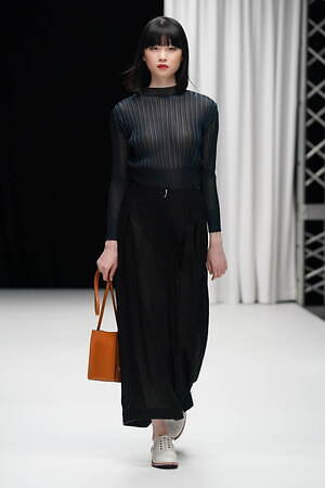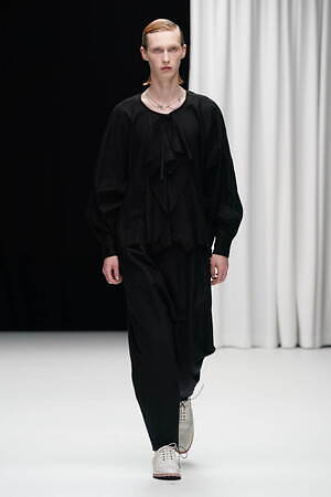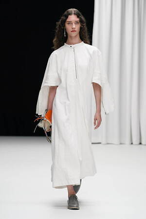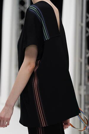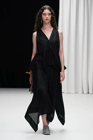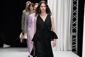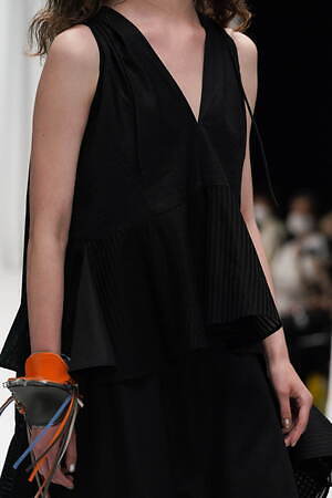 そしてショーのラストを飾ったのは、これまでのカジュアルさを取り払った、エレガントなブラックドレスだ。胸元のVネック、ひらりとなびくアシンメトリーな裾と、ブランドならではの美しいカッティングに、思わずうっとりする。しかしモデルが振り返ったとき、羽のように“ひらひら”と舞うスリーブの存在に気が付いた。そう、このドレスまでもやはり“進化”する一着なのだ。スリーブさえも、ドレッシーな表情へと変えていたその一着を含め、最後まで“騙された…”と、良い意味で思わせてくれるランウェイとなった。