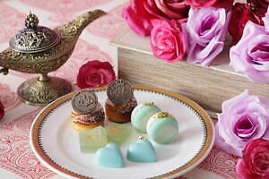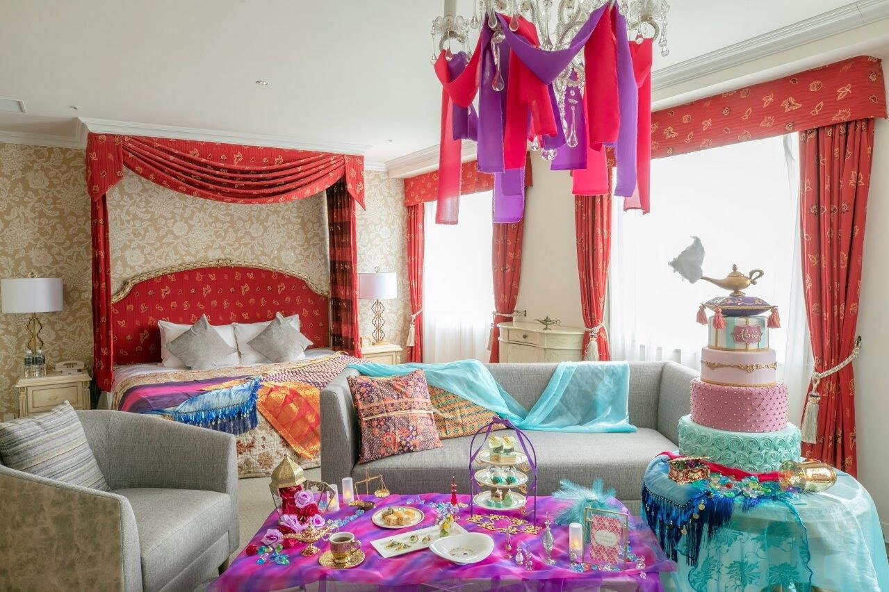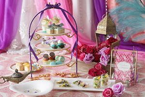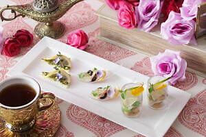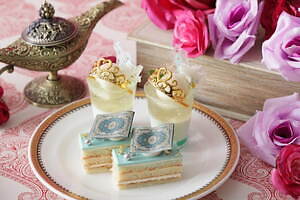 今回登場するプランでは、幻想的な装飾が施された空間で、ホテル内1階の「ストリングス ラウンジ」で展開されている「プリンセスアフタヌーンティー~アラジンと魔法のような恋~」をゆっくりと味わうことができる。魔法のランプを添えたヨーグルトムースや、洞窟の中に眠る美しい宝石を思わせるエメラルドグリーンのショコラ、ティアラを飾ったグラススイーツなど“アラジンと魔法のランプ”の世界からインスピレーションを得た華やかなスイーツが室内のテーブルにずらりと並ぶ。
