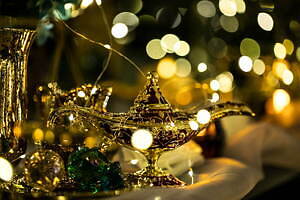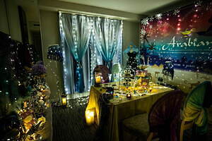 「アラジンと魔法のような恋~アラビアンプリンセスルーム」は、童話『アラジンと魔法のランプ』の世界をイメージして、ランプやきらびやかなドレス、キラキラと煌めくライトを飾ったデコレーションルーム。