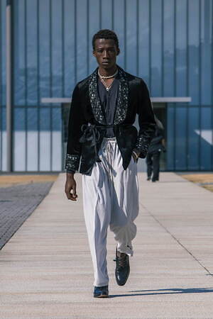 新作のオリエンタルジャケットは、1950年代から60年代にかけて、アジア圏の土産品として製作されたスカガウンをベースとしたジャケットだ。ボディには、レーヨン・キュプラのベロア地を使用する一方、衿やカフスには1688年創業の西陣織の老舗「細尾」によって織りあげられた素材を採用した。