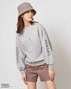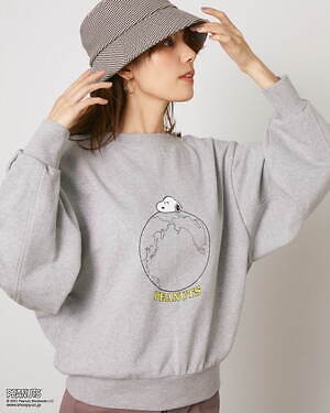オーバーサイズのボーダーニットは、背面にふわふわなスヌーピーのシルエットをオン。くすみピンクの他、オフホワイト、ネイビーといったカラーを揃える。