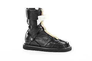一方グラディエーターサンダルを進化させた「スクエアピローライン」シリーズのブーツは、ラムレザーのインナーソックスに、グラディエーターサンダル特有のストラップを張り巡らせているのが特徴。ややエッジィな佇まいでありながら、ゴールドのラインを配した中央のストラップには、可憐なホワイトのリボンを装飾しているのがユニークだ。