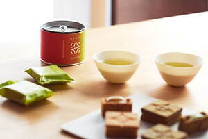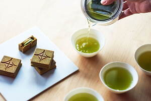 バターサンドとの相性を考えブレンドされた煎茶は、抹茶の味わいをより引き立てる、濃厚な味わい。旨み豊かな京都府産宇治茶「やぶきた」玉露と、深みのある鹿児島県「霧島」産の「さえみどり」といった2つのシングルオリジン煎茶を、絶妙な割合で組み合わせている。
