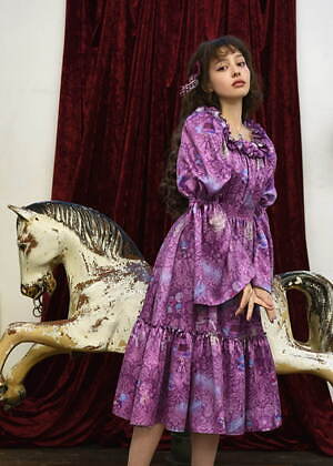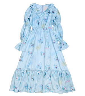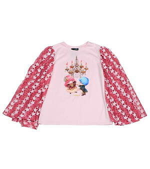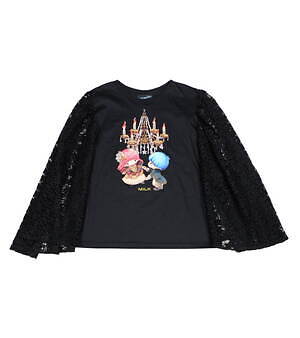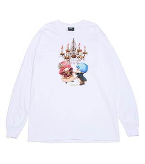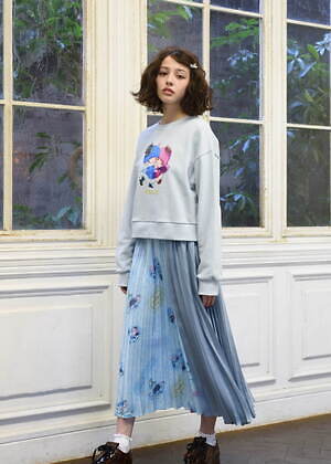 たとえば、フェミニンなパフスリーブトップスにはナポレオンやマリーアントワネットに扮したキキ&ララをデザイン。バイカラーのプリーツスカートには、王冠やティアラをかぶったキキ&ララや、シャンデリアの下でダンスをするふたりを総柄であしらい、キュートなムードを演出した。