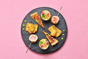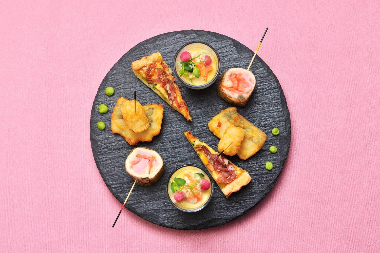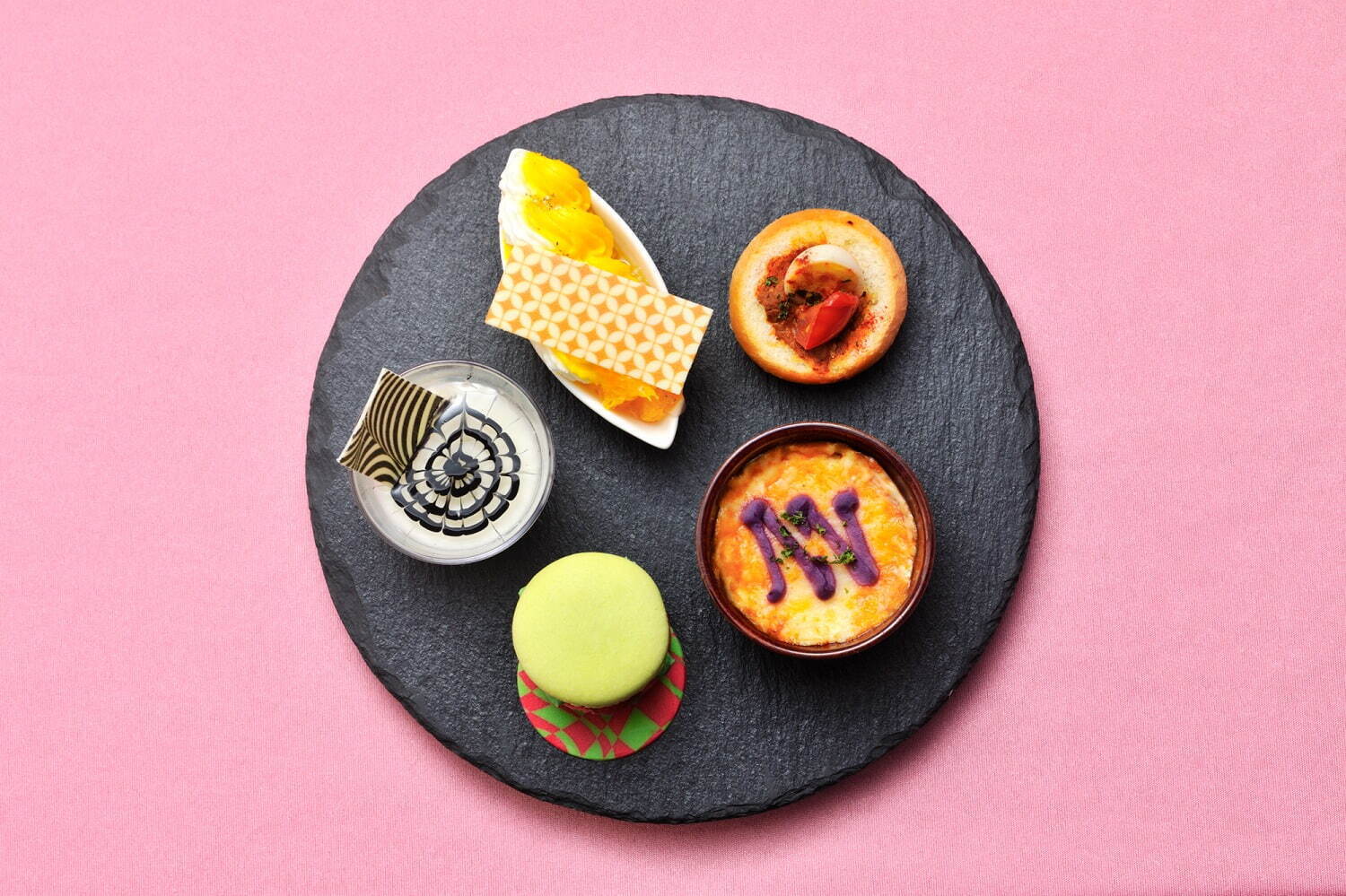 メニュー:サングラスのテリーヌショコラ、ワンピースのアイシングクッキー いちごと柿を添えて、ローヒールのミニエクレアタルト、オレンジと洋梨のムース、パンナコッタ 竹炭ジュレ、ラズベリーとピスタチオのマカロン、チリビーンズブレッド、ラザニア 紫芋のピューレを添えて、ハムのキッシュ、プティフィッシュ&チップス、スモークサーモンとビーツのポテトサラダロールサンド、シュリンプとキヌアのサラダ オレンジ風味のソース、「ハフキンス」スコーン(プレーン味)