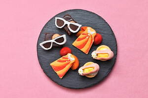 Aラインのミニワンピースを象ったアイシングクッキーや、サングラスのテリーヌショコラ、ローヒールシューズのミニエクレアタルトなどポップなスイーツが揃う。