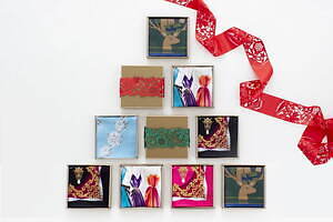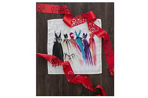 ピンクやパープル、ライトブルーなど、様々なドレスが並んだ姿を描いた「ドレス」は、持っているだけでテンションが上がる、ハッピーな仕上がり。19世紀のジュエリーや装飾をモチーフにした「ジュエル・キャレ」は、一点一点繊細に描かれたモチーフが職人技を感じさせる。