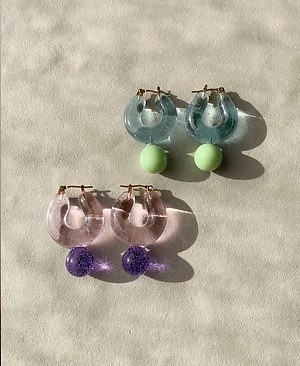 おすすめガラスジュエリーは、U字ガラスと球体ガラスを組み合わせたインパクトのあるフープピアス。カラーは、ブルー×ミルキーグリーンと、ピンク×パープルの2色が揃う。