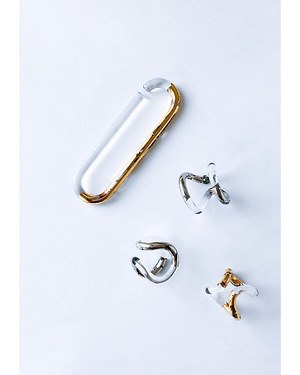 そんなベレッツア ガラス ジュエリーのおすすめは、繊細なガラスにゴールドやシルバーを組み合わせたイヤーカフだ。楕円形や重ね付けをしているように見えるイヤーカフに、ガラスの透明な部分を残しながら金彩やプラチナ彩を焼き付けることで、華やかなムードを演出した。