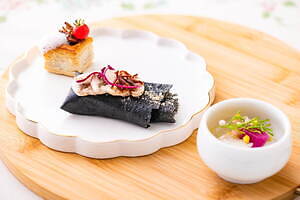 セイボリーは全6種類。ゆず胡椒を効かせたぶり大根や、ホワイトマッシュルームのムース&半熟卵を巻いた竹炭クレープ、ズワイガニのムースやフォアグラのムースなどが揃う。