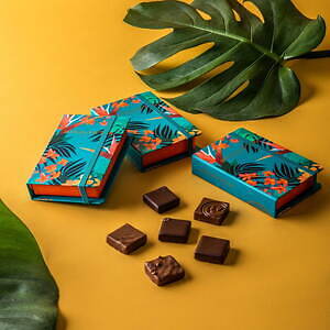 カカオの育つ“熱帯のジャングル”をイメージした、トロピカルなデザインボックスの中には、これまで手掛けてきたショコラの中から、シェフが大好きなものだけを厳選して詰め込んだ。特に、ドミニカ共和国サント・ドミンゴのカカオを使用したボンボンショコラは、シェフのお気に入りで、カカオの生産者や生産地への敬意を込めて作られたという。
