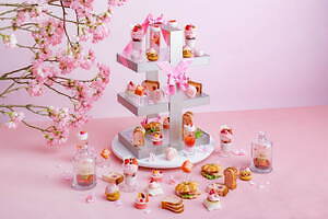 ANAクラウンプラザホテル大阪で人気の「ピンク アフタヌーンティー」が、春の「サクラ」をテーマに登場。"ピンクのリボン"がテーマのハイティースタンドには、旬の食材を用いたスイーツ&セイボリーが並んでいる。